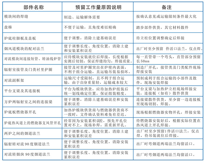加熱爐及其它爐類產(chǎn)品可進(jìn)行工廠模塊化設(shè)計(jì)、預(yù)制、運(yùn)輸及現(xiàn)場安裝。采用思路:工廠深度預(yù)制一部件組合運(yùn)輸一現(xiàn)場快速組對(duì)安裝、調(diào)試。加熱爐模塊化設(shè)計(jì)及工廠模塊預(yù)制的優(yōu)點(diǎn)有:供貨范圍和各方責(zé)任清晰明確、減輕業(yè)主采購工作量、減少現(xiàn)場施工量及制作場地、能更好的保證施工工期和質(zhì)量、減少現(xiàn)場施工量及制作場地。我們可根據(jù)設(shè)計(jì)總圖提前進(jìn)行模塊化設(shè)計(jì)、確定模塊預(yù)制方案、模塊運(yùn)輸方案及現(xiàn)場拼裝方案,再報(bào)業(yè)主和設(shè)計(jì)方確認(rèn),從而節(jié)省設(shè)計(jì)時(shí)間。隨著加熱爐大型化的趨勢,以及道路運(yùn)輸?shù)倪M(jìn)一步規(guī)范,工廠預(yù)制模塊的尺寸設(shè)計(jì)應(yīng)盡量能控制在:長22米,寬3.0米,高度3.3米以內(nèi)。